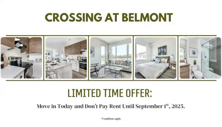-------------About**Limited-Time Offer: Move In Today & Don't Pay Rent Until September 1st, 2025. Contact Us For Details.** Crossing at Belmont consists of two, five-storey rental buildings with 156 apartment suites. Located in Langford, BC, Crossing at Belmont features meticulously designed apartment suites that epitomize ease and convenience. Features such as bike-washing & repair stations, underground kayak storage, and pet grooming station will cater to the active lifestyles of our residents seeking healthy, urban-meets-suburban living. This unique urban community is located alongside the Galloping Goose Trail sets a new standard for rental living in the West Shore. Community AmenitiesElevatorsGuest SuiteEV Charging StationStorage SpaceCertified Rental BuildingOn-Site Professional ManagementSuite Amenities