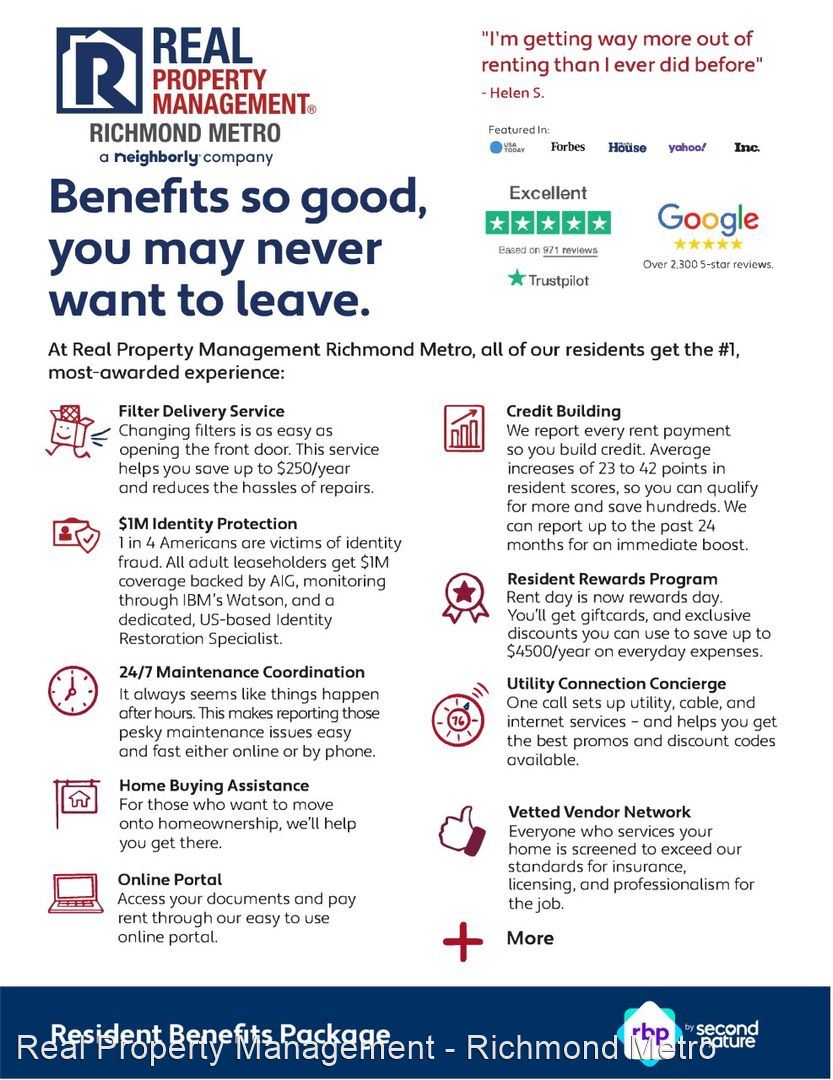 ***The Real Property Management Richmond Metro Resident Benefit Package is designed to provide convenience, professional services, and cost savings to our residents. By applying, Resident(s) agree to be automatically enrolled in the program and agrees to pay an additional $39 per month, payable with rent.